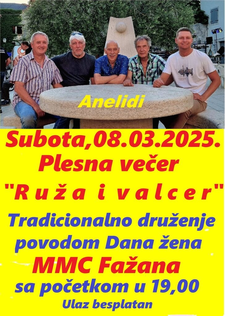 Tradicionalno druženje povodom Dana ženaTradicionalno druženje povodom Dana žena uz Anelide u MMCV Fažana 08.03. s početkom u 19:00 sati.